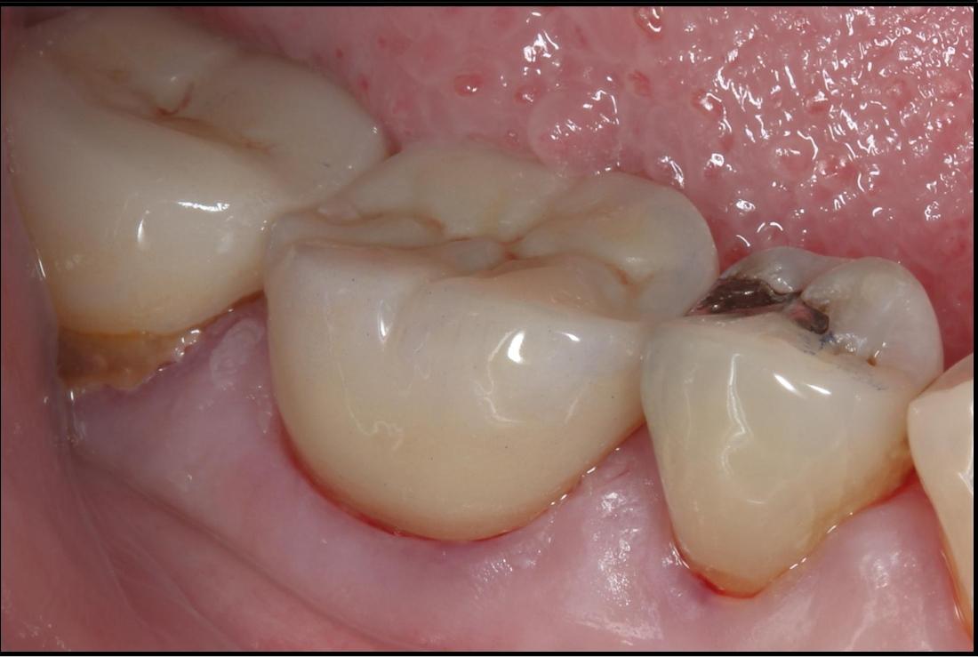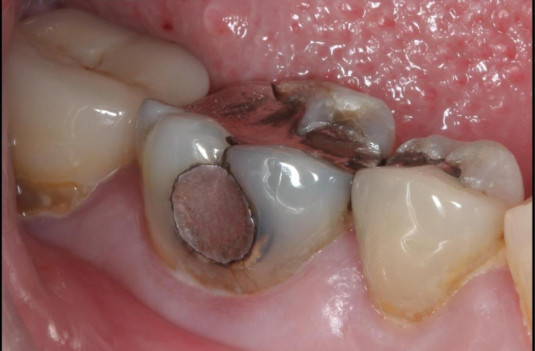 Large amalgam fillings very often lead to the fracturing of teeth over time. This tooth had a large amalgam filling which had begun to leak, allowing bacteria to enter and cause decay. It also had a fractured cusp and several other developing fractures. If left untreated, further breakdown would have lead to toothache and possibly the need for extraction. Here a crown was placed, giving it a new hard wearing outer shell that will prolong the life of this tooth.